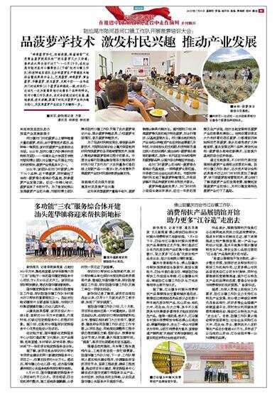“神湾菠萝好吃,肉细爽脆,甜蜜清香”“还是黄金菠萝别具风味”“西瓜菠萝又大又好看,拿来送礼再合适不过了”……6月29日,在驻汕尾市陆河县河口镇帮扶工(下称“驻河口镇工作队)科技特派员团队主办的菠萝生产管理技术培训会暨成果展示会上,巴厘菠萝、神湾菠萝、黄金菠萝、手撕菠萝、西瓜菠萝、无刺卡因……去年在对门村试种的16个菠萝品种摆成一排,村民们一边试吃一边兴致高昂地讨论着各个品种的特点。驻河口镇工作队表示,这次活动通过试吃品鉴、基地参观、技术讲解,提高了村民对菠萝产业的兴趣与信心,为发展菠萝产业迈出了关键的一步。