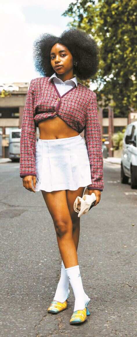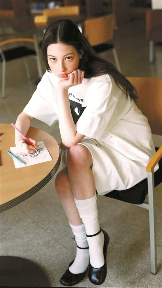 不过需要注意的是白袜长度,控制在脚踝以上、小腿肚以下的位置,不要过膝,视觉上予人“三七分”的效果显腿长。