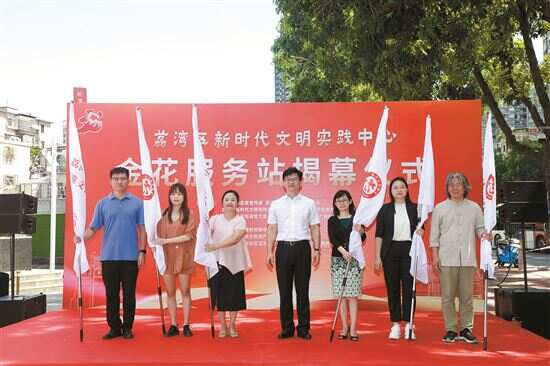 在当天的活动上,荔湾区领导为六支特色新时代文明实践服务队授旗,未来,他们将以金花服务站等荔湾区新时代文明实践阵地为核心,围绕各自工作专长,开展文艺、文化、医疗健身、三棋科普、非遗文化传播等各具特色的志愿服务。