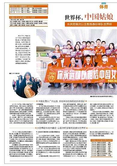 昨天下午,中国女足从广州白云国际机场启航,踏上了前往澳大利亚的征途。这是中国女足第8次进入世界杯决赛圈,也是主帅水庆霞第一次带队参加世界杯。尽管中国女足此次签运不佳,小组对手的实力很强,但中国女足的将帅都表示一定会全力以赴。水庆霞说:“无论接下来遇到什么情况,我们都会面带微笑迎接挑战。”