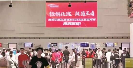 ■广州白云机场的大屏幕上打出了“铿锵玫瑰 绿茵王者”的海报,为女足壮行。
