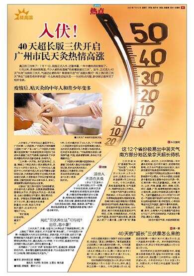 6月以来,多地持续高温,不少人被热到直喊“热度爆表堪比三伏”。如今,正式进入40天“长效”加持的三伏天,气温还会更热吗?哪里将开启“伏”汤蹈火模式?网上流行的三伏天“养生”法是否有科学依据?什么疾病适合贴天灸……针对热点问题,新快报记者采访了相关专家。