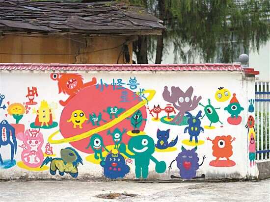 墙绘也是本次公益行动中的重头戏。在这些艺术课程开展的前一天,孩子们在美术老师的指导下,在教学楼后的一面空墙画出自己心目中的小怪兽,组成一面小怪兽星球墙。