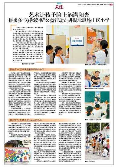7月3日,拼多多“为你读书”公益行动联合羊城晚报艺术研究院,走进堆子场小学,为这所山区学校带来书香,捐赠了约150种、3000册图书,以及书柜、桌椅等学习用品。还邀请了知名艺术家、作家为孩子开展丰富多样的艺术课与写作课,推广城乡“知识普惠”。