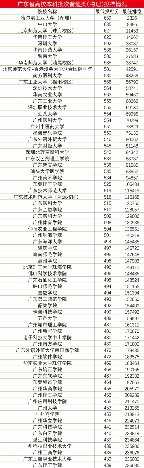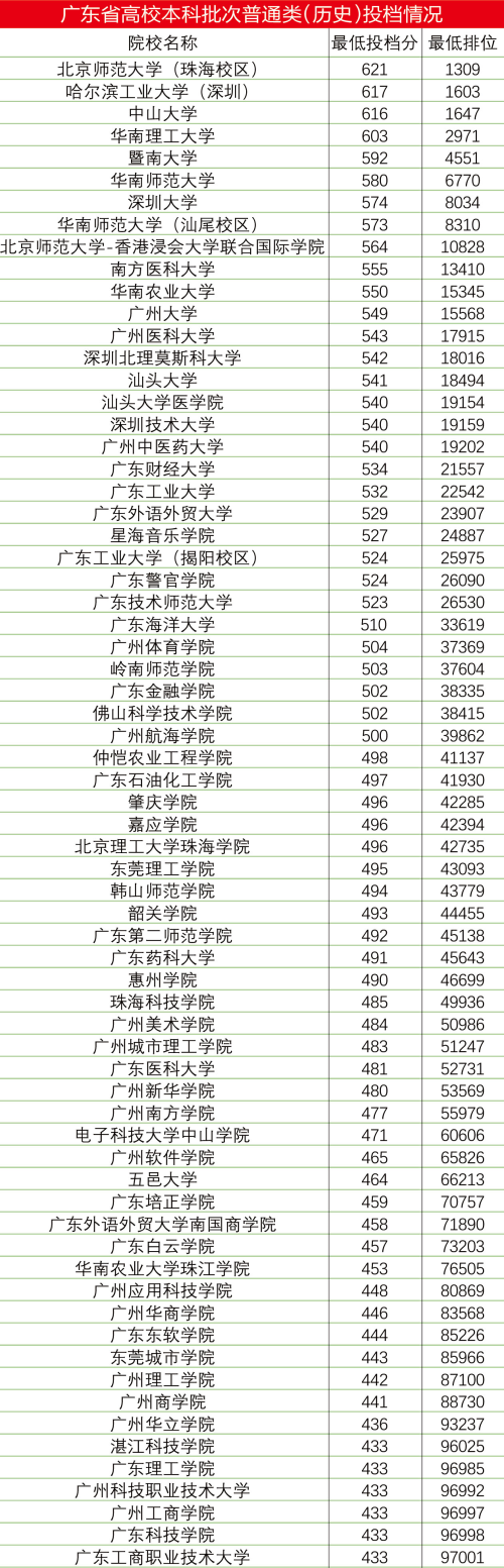 从各大高校录取最低排位来看,今年广东高校的排序也发生了变化。普通类(历史)最低排位排序中,中大、华工、暨大依然稳居前五,另哈尔滨工业大学(深圳)、北京师范大学(珠海校区)录取的最低排位,也进入前五。普通类(物理)方面,哈工大(深圳)和北师大(珠海校区)也进入前五,此外,排名前列的分别为中大、华工、深圳大学、华南师范大学和暨南大学等。其中,暨大最低排位下降了12837名,广州大学在普通类(物理)最低排位较去年下降151613名。记者从广大了解到,今年广大本科批投档除建筑规划与土木工程专业组外,最低排位66714,其他专业组投档分都正常,绝大部分专业组的最高分、最低分及排位都有提升。