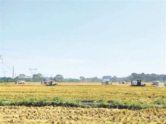 新快报讯 记者农艳芳 通讯员邹玉芳报道 盛夏时节,稻谷飘香,在杨梓榔村水稻种植示范基地,8台联合收割机正在金黄的稻田里来回穿梭,收割、脱粒、禾草粉碎、颗粒入仓一气呵成,收割机的轰鸣声奏响丰收曲。新快报记者了解到,今年初,在茂名市茂南区农业农村局牵头引领下,5家农机合作社抱团组成茂名市顺心农业机械合作社联合社(下称“联合社”),提供育秧、机耕、机插、施肥、喷药、机收、烘干等一条龙全机械托管服务。