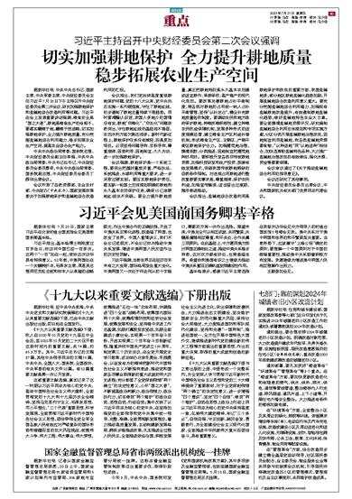 据新华社电 中共中央总书记、国家主席、中央军委主席、中央财经委员会主任习近平7月20日下午主持召开中央财经委员会第二次会议,研究加强耕地保护和盐碱地综合改造利用等问题。习近平在会上发表重要讲话强调,粮食安全是“国之大者”,耕地是粮食生产的命根子,要落实藏粮于地、藏粮于技战略,切实加强耕地保护,全力提升耕地质量,充分挖掘盐碱地综合利用潜力,稳步拓展农业生产空间,提高农业综合生产能力。