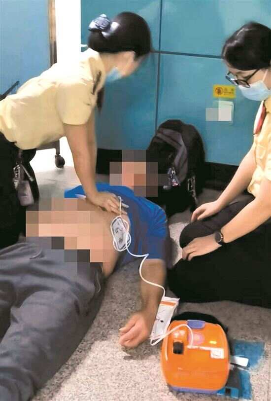 在列车发车开往下一站坦尾的途中,坦尾站已准备好AED除颤仪。列车到站后,坦尾站值班站长冯志鹏携带AED以最快的速度跑上列车,并迅速打开AED,与两名热心医护乘客一起为老人实施AED除颤。