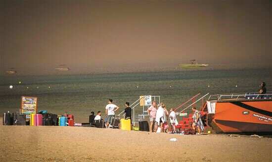 ■人们在海滩上等待撤离。新华社发