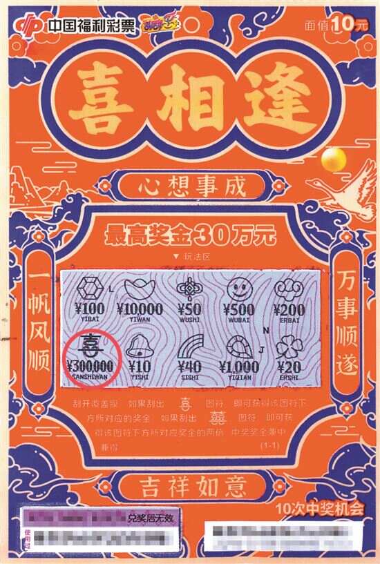福彩刮刮乐,欢乐喜相逢!让公益与美好相逢,让爱心与幸运相逢!“喜相逢”游戏票面以中国传统纹样喜字纹为设计灵感,吉庆、典雅,以红蓝为主色调,辅以祥云和传说中寓意吉祥的仙鹤,票面覆盖膜的四周印有“心想事成”“一帆风顺”四字成语,传递着美好祝福。