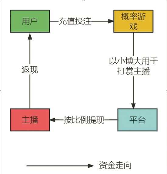 从这个角度来说,涉赌的可能是平台、公会、主播个人或者兼而有之。比较典型的平台涉赌案例中,有部分平台以直播为幌子,在直播间中设置概率类游戏,并对外宣传概率游戏的玩法吸引赌客,赌客通过向平台充值获得虚拟币,用虚拟币投注概率游戏,获得超过投注价值的奖品,再将奖品打赏支付给主播,主播利用自身的提现功能扣除抽成后将剩余的金额支付给赌客,从而实现完整的“上下分”功能。