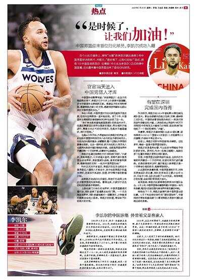 相信在下个月,李凯尔就将代表中国男篮出场比赛。8月下旬在深圳举行的“国际团结杯”,中国球迷非常有希望在家门口看到李凯尔身披中国队战袍出场的身影。