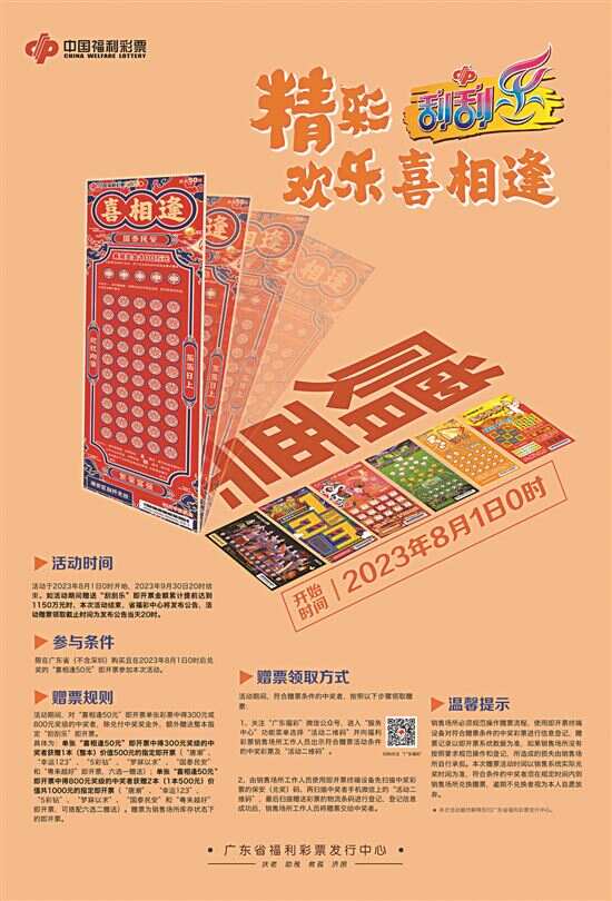 活动期间,凡在广东省(不含深圳)内购买“喜相逢50元”即开票游戏,且在2023年8月1日0时至9月30日20时兑奖,可参加本次赠票活动。如活动期间赠送刮刮乐即开票金额累计提前达到1150万元时,本次活动结束,省福彩中心将发布公告,活动赠票领取截止时间为发布公告当天20时。