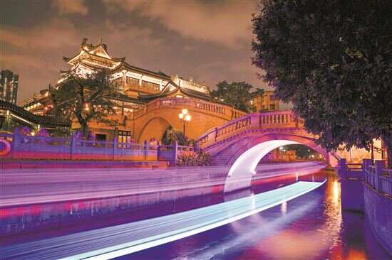 ■夜幕下永庆坊的月亮桥,以其独特的形状和璀璨的灯光吸引了众多游客,游船的流光点缀着城市之夜。新快报实习记者 刘浩靖/摄