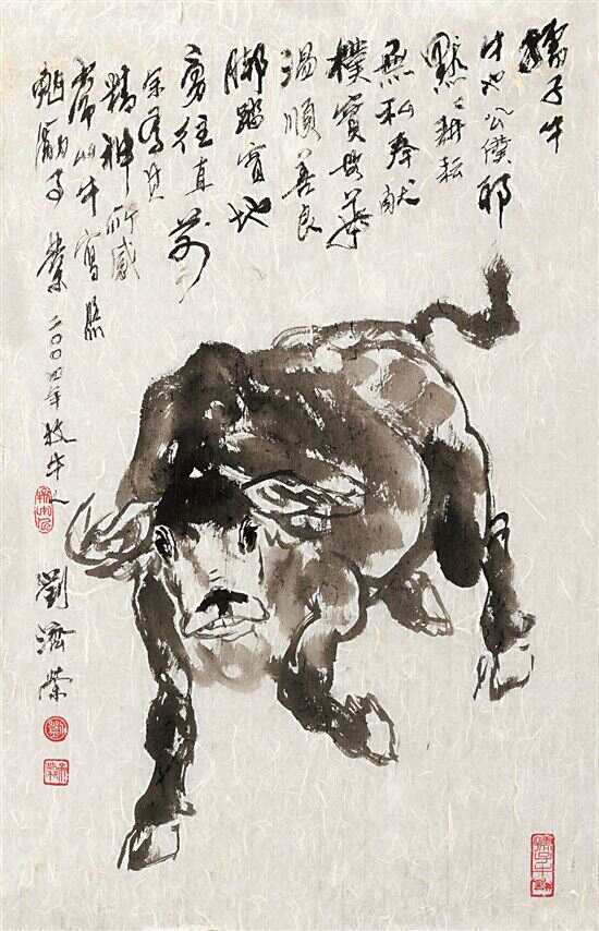 他经常强调,艺术要有牛这样的劲头和献身精神。而在他的作品与为人处世中,确实也能看到这种精神。他的画透露出生生不息的生活特点,这是上世纪五六十年代涌现出来的画家的共同特点,只是,这种特点在刘济荣身上表现得尤为明显。与他同代的画家中,有些随着时代的变迁,与生活密切结合的这条路早已有所改变,纷纷向形式、抽象、意念等方面开拓,而刘济荣反而更加深入生活,与时代脉搏密切联系的这种画风,一直到他去世之前都在坚持。而在这个方向上,他画得最多的,就是牛。两种不同的牛,一种是岭南农村的水牛,另一种则是西藏的牦牛。珠三角和客家的牛所占分量最多,他笔下是牛,口头也说牛,广东曾流行一句话,对画画很努力的人称为“画牛”。这个“画牛”在刘济荣身上体现得最为典型,他更自称是 “岭南的牧牛人”。
