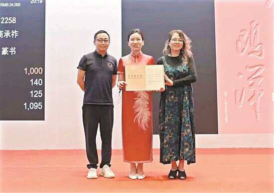 ■广东省杨之光艺术教育基金会理事长、杨之光女儿杨红(右)和广州艺术品行业商会会长向仕杰(左)为拍卖师颁发“白手套专场”证书。