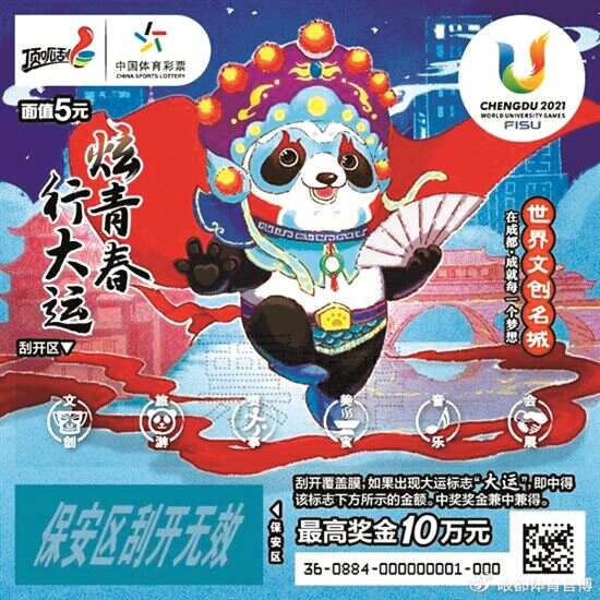 5元面值的“炫青春 行大运”以大运会的吉祥物“蓉宝”为主形象,围绕“三城三都”为主题进行纯手绘创作,在这套票面里,熟悉的宽窄巷子、神奇的川剧变脸、好吃到咂舌的川菜全都一一登场。每一张“炫青春 行大运”彩票都是成都的名片,6张彩票分别对应了世界文化名城、世界旅游名城、世界赛事之城、国际美食之都、国际音乐之都、国际会展之都,体彩顶呱刮传递“三城三都”城市品牌内涵。