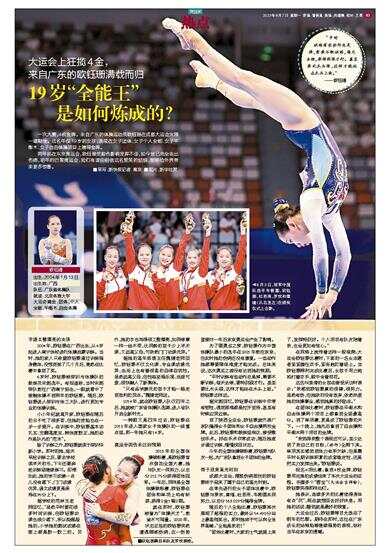 在团体比赛时,欧钰珊在平衡木和自由体操两个项目上都拿到全场最高分。到了单项赛,更是成了欧钰珊的天下。一个晚上,她先后拿到了自由操和平衡木两个项目的金牌。