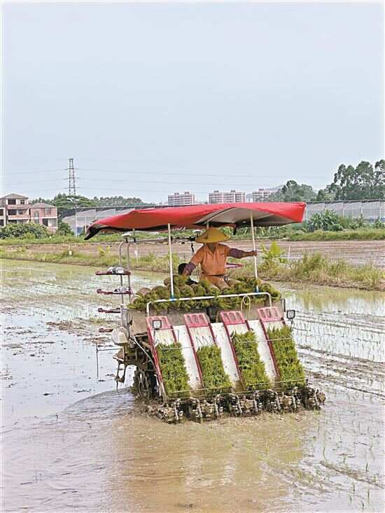 ■增城区丝苗米现代农业产业园的工人们正驾驶着播种机播栽晚稻。