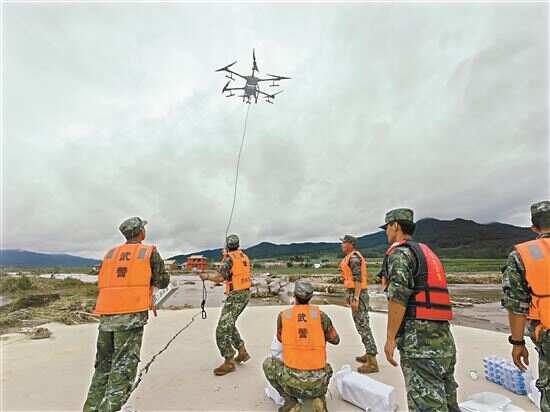 ■武警吉林总队吉林支队官兵利用无人机向舒兰市被洪水围困的群众空投食品和饮用水。新华社发