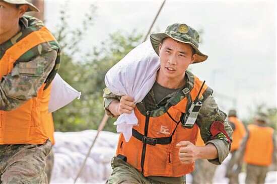 ■8日,陆军第78集团军某旅官兵在哈尔滨市双城区运送筑坝沙袋。 新华社发