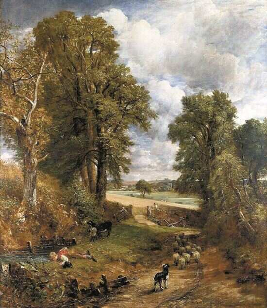 西方油画中,同样不乏秋天景色的名作,例如描绘英国一个小村庄的《麦田》是康斯太勃尔的代表作,这幅画上的景色,被称为典型英国式的农村风景。描绘了田园丰收的金秋美景,在收割的季节里,一位农夫正在田间忙碌着。灿烂的阳光穿过厚厚的云层照射在富饶的土地上,微风掠过,老橡树的枝叶飒飒作响,树下一名年幼的牧童正在啜饮清冽的河水。画面细节精致逼真,色彩浓郁厚重。