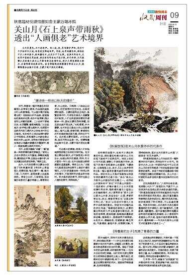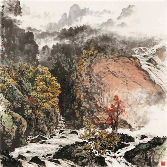 在岭南的绘画中,也有不少表达秋意的作品,例如著名岭南大家关山月先生笔下就有不少经典名作。他在上世纪80年代初期,曾醉心于表现南方雨林,其笔下的南方呈现森林山峦蓊郁、飞瀑流泉、云烟湍急之态,其中,《石上泉声带雨秋》是一幅以重彩浓墨写就雨林秋深的作品。深圳市关山月美术馆副馆长陈俊宇向收藏周刊记者介绍,“泉石”是关山月晚年山水画创作的主题之一。在传统山水画体系中“泉石”不仅是山水画的一个组成部分,亦喻示着文人士大夫的高洁操行和志向,隐然寄托着古人登临山水的幽然情怀,宋人郭熙所言“君子之所以爱夫山水者,其旨安在?丘园,养素所常处也;泉石,啸傲所常乐也”正是这种平和心态,“泉石”从而成为中国文人世界中自然美的象征。陈俊宇对这幅作品的评论写道,“强调笔的表现力,近景的窠石和松树几乎全是直接勾勒完成,用笔苍劲浑厚,粗细相兼,除略施淡墨染坡岸远峰,渲染极少,显得境界开阔爽朗。长松巨木,清幽绝胜,回溪断崖,峰峦秀起,气象清朗,着笔不多,而情景交融,可谓神韵独绝,显示出关氏晚年山水画‘人画俱老’的艺术境界。”