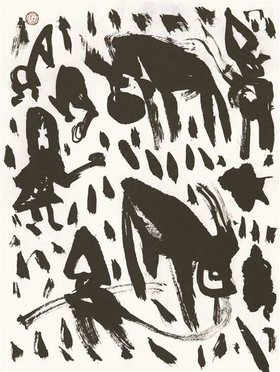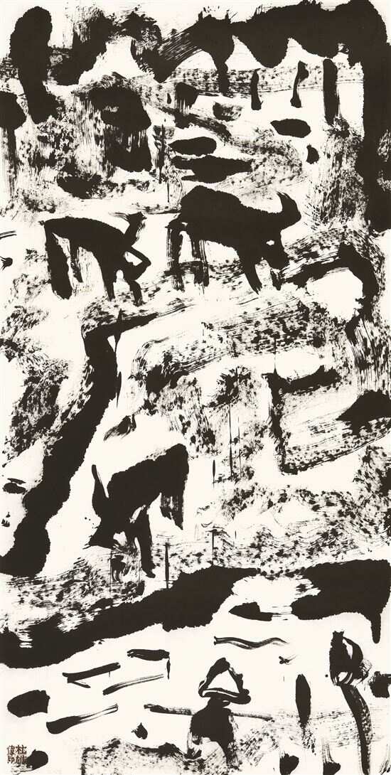一牛在版画方面取得了喜人成就之际,毅然华丽转身,以刀易笔,进军国画行列,将版画的艺术形式融入中国画的笔墨语言和笔墨结构中。虽然是画种的转换,但艺术观念和风格是共通的,只是多了对传统国画经典作品的倾注和研究。开始对国画灵魂性的笔墨线条的敬畏。他学习吸收黄宾虹的笔墨精神和艺术营养,活学活用,将其融进自己的水墨世界。如乡野水墨作品:《春》是本次展览的海报作品,以版画、剪纸黑白关系为基调,以浓墨铺毫、舍形求神的符号性笔墨语言,表现村边屋后,农夫农妇耕作于地头田间,鱼、鸟、鸡、鸭,墨梅呼映,好一派盎然春色。整个画面以纯浓、干、焦墨体现,点线疏密通透,层次分明,细节丰富耐品,是一幅有视觉冲击力的抒怀畅意佳构。《牧》表现了村后田塘:三牛错落有致,闲适尽享乡野气息,符号性的农夫和荷花元素,交代了夏秋的节令,此作品值得称道的是整个画面的干焦墨色沙涩的笔墨处理。《田间大写之二》也与之有异曲同工之妙。《在野之一、二、三》均以极简和肯定的笔调、极纯的墨色、极符号性的表现手法体现。《故土》则是极繁密的作品,12张4尺整纸,272×408cm,近百平尺的作品。震撼列阵,高响乐式的礼赞故土,集乡间寻常百姓,牛、狗、鸡、鸟于通篇,黄宾虹的五笔七墨之法在此作品中得到了淋漓尽致的呈现。作品《村桥原树似吾乡》《渔歌阵》均为180×388cm的72平尺大作,形成一牛水墨三部曲。“吾乡”极繁密而通透,“渔歌”疏朗而舒心,《催程曙色微》《开荒南野际》《山路宿云散》等,一牛在色彩构成技法的妙用,富装饰味的画面,打散开合,放大式的点彩法,使画面密而通风,符合黄宾虹“墨团团墨里墨团团,墨团团里天地宽”的笔墨理念。