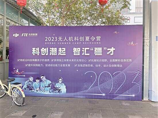 ■园区中竖立着无人机夏令营背景板。