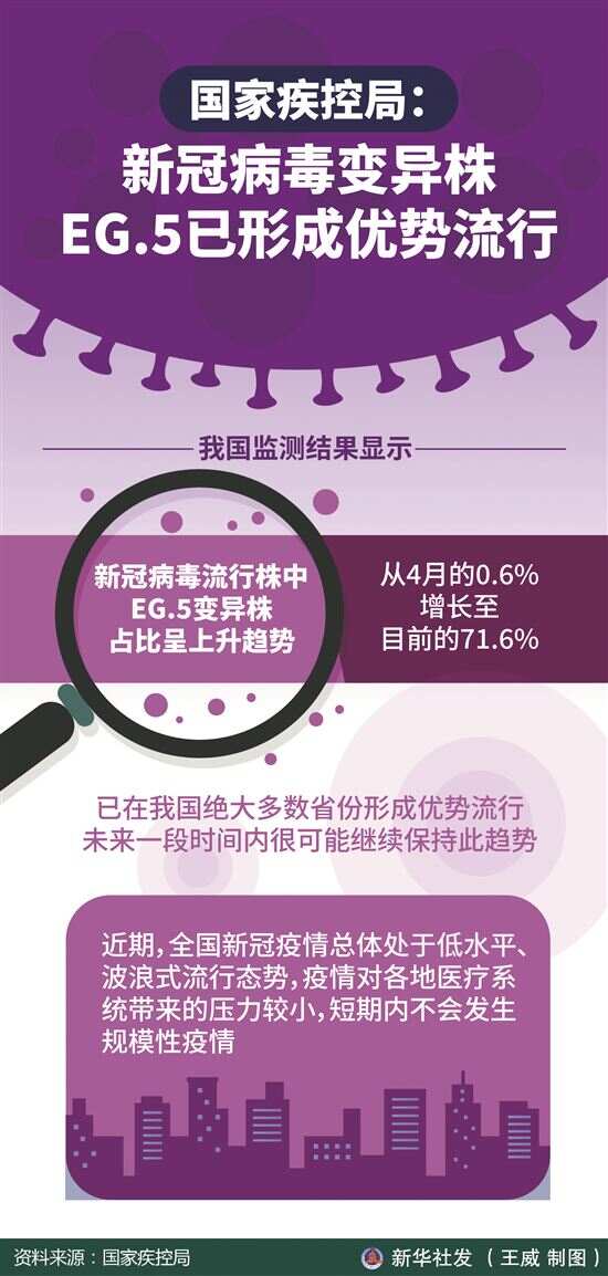 据新华社电 记者8月19日从国家疾控局获悉,我国监测结果显示,新冠病毒流行株中EG.5变异株占比呈上升趋势,从4月的0.6%增长至目前的71.6%,已在我国绝大多数省份形成优势流行,未来一段时间内很可能继续保持此趋势。近期,全国新冠疫情总体处于低水平、波浪式流行态势,疫情对各地医疗系统带来的压力较小,短期内不会发生规模性疫情。