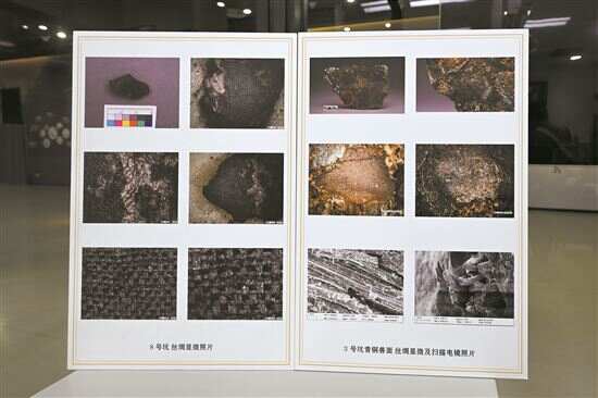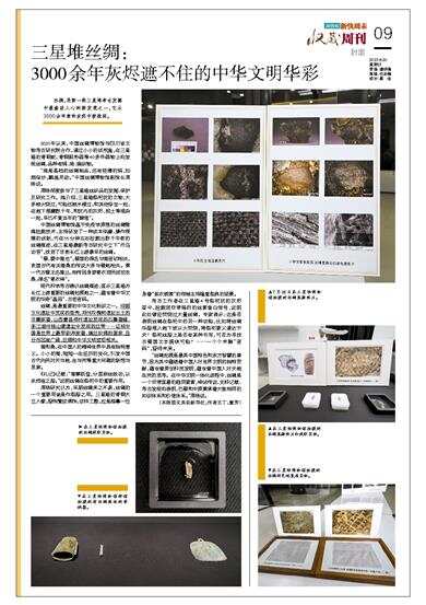 ■在三星堆博物馆拍摄的丝绸显微照片和提取实物。