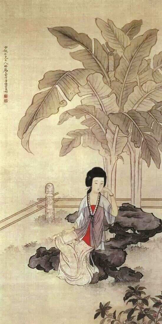 古代读书图中,也不乏女性题材,清华大学美术学院收藏有晚清画家吕彤绘制的一幅仕女图。图中绘有一位清丽纤柔的女子,她倚坐着一块玲珑有致的太湖石,左手托腮,右手放在膝头的一卷书上。在她的身后有两株茂盛的芭蕉。画家并没有给这幅画命名,人们根据画面显而易见的元素——芭蕉、书籍,称之为《蕉荫读书图》。李晓愚还研究发现,类似《蕉荫读书图》,早在明代就有出现,明代黄石符的《仙媛幽憩图》就与之极为相似。