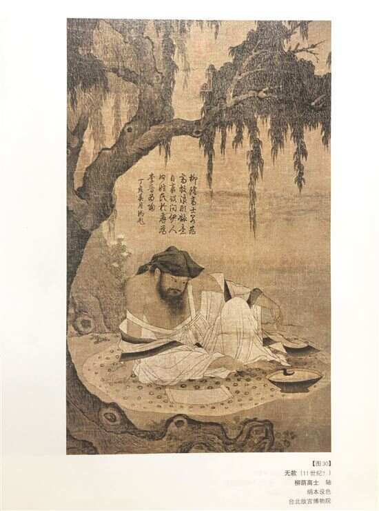 年代约为宋代,但至今无法确认作者的《柳荫高士》描写的对象,或是东晋到南朝时期的诗人陶渊明,他辞官归隐田园,是后人眼中的理想文人隐士。他坐在一块豹皮毯上,形态闲逸,头垂在两肩之间,容颜冥想着,眼睛眯索着,正是沉思的表情。前面地上放着一碗酒、一卷白纸,正酝酿着诗句。