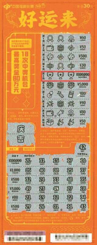玩法二:刮开覆盖膜,如果刮出“好运来”图符,即可获得100元奖金,中奖奖金兼中兼得。