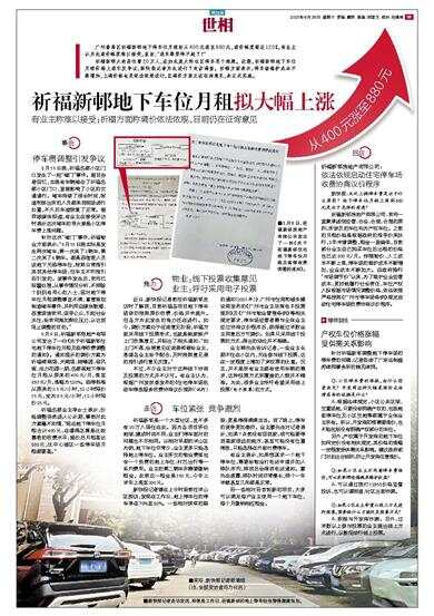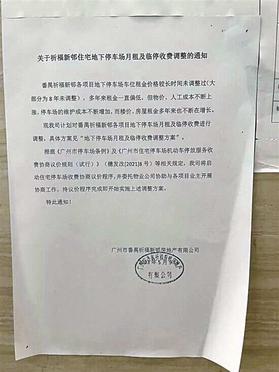 5月9日,祈福新邨房地产有限公司发出了一份《关于祈福新邨住宅地下停车位月租及临停收费调整的通知》。通知显示的调价方案为祈福倚湖居、天湖居、晓峰园、迎风阁、活力花园一期、名都阁地下停车位月租从原来的400元/月,涨至880元/月,涨幅为120%。临停标准从原来的2.5元/小时,12小时限价15元,变为3.5元/小时,12小时限价25元。