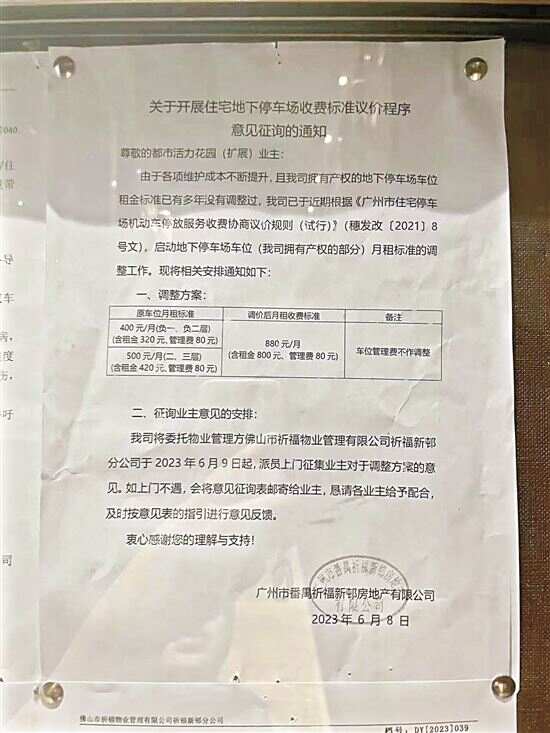 近日,新快报记者前往祈福新邨走访时了解到,目前祈福各项目地下停车场依旧按照原价收费,价格并未提升。但各方为此发生的角力还在进行。如今,调价方案处于征询意见阶段,祈福方面采用线下投票形式,也就是挨家挨户上门收集意见,并贴出了相关通知:“如上门不遇,会将意见征询表邮寄给业主,恳请各业主给予配合,及时按照意见表的指引进行意见反馈。”
