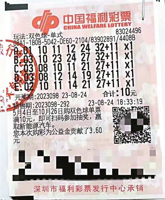 据核查,广东头奖落户深圳,中奖彩票是一张10元5注自选单式票,由龙华区民治街道塘水围老村73栋103铺83024496投注站售出。