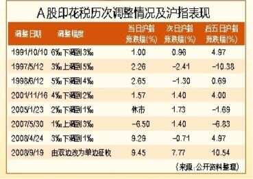 以时间最近的两次下调来看,2008年4月24日,印花税由3‰下调至1‰,当日上证指数暴涨9.29%;2008年9月19日,印花税由双边征收改为单边征收,当日上证指数暴涨9.45%,所有A股股票涨停。这两次降低印花税后的5个交易日上证综指涨幅为5.0%、10.5%,市场日均成交额环比提升112.6%、116.5%。