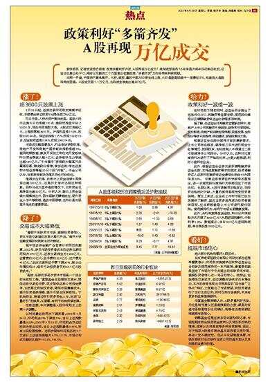 新快报讯 记者涂波综合报道 政策多重利好齐发,A股再现万亿成交!继财政部宣布15年来首次减半印花税征收后,证监会也推出在IPO、减持以及融资三个方面推出密集政策,“多箭齐发”为市场带来积极预期。