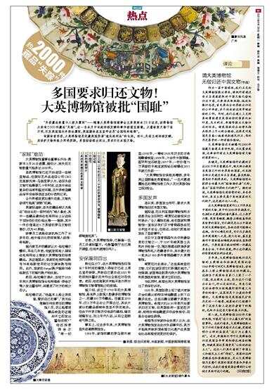 作为一家中国媒体,我们正式向大英博物馆提出要求,请把所有通过非正当渠道获取的中国文物无偿地归还中国,不要再采取抵触、拖延和敷衍态度,首先要向全世界做出归还的公开承诺,并尽快启动这项早就该做的工作。同时,我们在道义上支持其他曾经遭受英国劫掠的国家比如印度、尼日利亚、希腊等提出文物归还的诉求。请英国政府在法律及相关程序上予以配合推动,这将是对英国是否真心诚意洗刷殖民污点、弥补历史罪责的一种考验和验证。