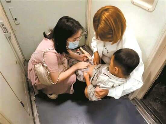 因担心治疗影响到其他旅客,李维英在列车连接处为小男孩进行治疗。她找准穴位为其进行艾灸并按摩,边治疗还边安抚小朋友。短短几分钟后,小男孩的疼痛得到缓解,不久后就完全康复。