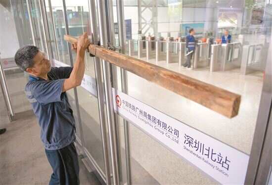 ■9月1日,在深圳北站出站口前,工作人员加固玻璃门。新华社发