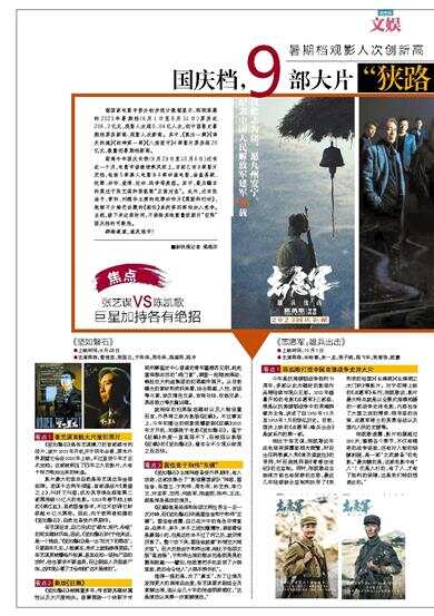 距离今年国庆长假(9月29日至10月6日)还有近一个月,电影市场继续乘风而上,目前已有9部影片定档,包括5部真人电影与4部动画电影,涵盖悬疑、犯罪、动作、爱情、运动、战争等类型。其中,最为瞩目的莫过于张艺谋和陈凯歌“正面对垒”。此外,还有张涵予、黄轩、刘德华主演的犯罪动作片《莫斯科行动》,炮制不少婚恋话题的《前任》系列第四部均加入竞争。当然,接下来这段时间,不排除其他重量级新片“空降”国庆档的可能性。