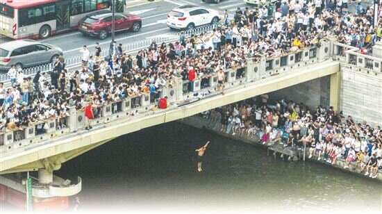 如今,海河上的狮子林桥已是天津新晋的“8A景点”,桥上天天都围满了人,从桥上到岸边,里三层外三层地一眼望不到头,都是来围观天津大爷跳水以及跃跃欲试参与其中的游客。面对现在的“网红效应”,天津大爷呼吁安全第一,劝阻年轻人不要盲目跟风。