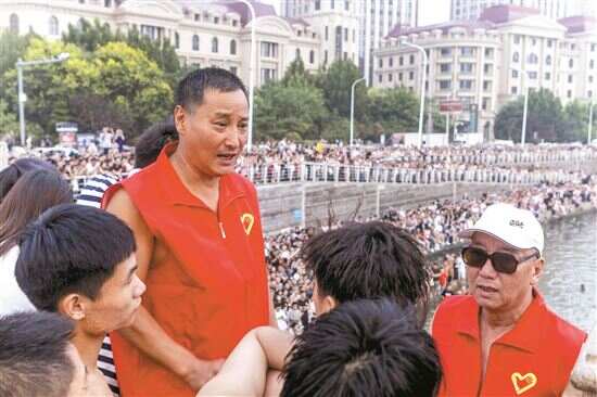 上午10点开始,眼看桥上跳水的人越来越多,在水里游泳的几个大爷赶紧上岸,有的拿起喇叭喊话,维持秩序。最近,天津大爷已经没空跳水了:每天都在劝退年轻人,最近还救上来好几个。