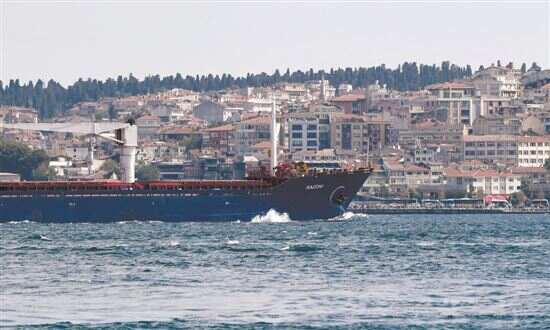 ■2022年8月3日,从乌克兰敖德萨港出发的首艘运粮船“拉佐尼”号经过位于土耳其伊斯坦布尔的博斯普鲁斯海峡。新华社发