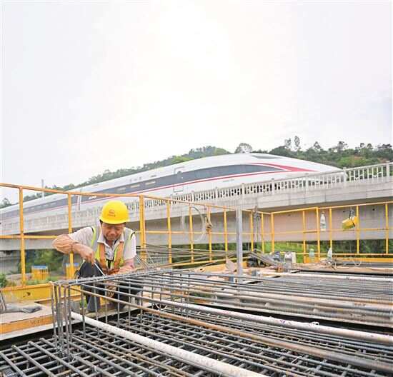 9月6日,中铁四局施工人员在深(深圳)江(江门)铁路深圳段高峰水库大桥上进行主墩施工。近日,阳台山隧道和深莞隧道(联络线)等深江铁路深圳段重难点控制性工程开始进洞施工,全线施工生产进入全面提速阶段。新华社发