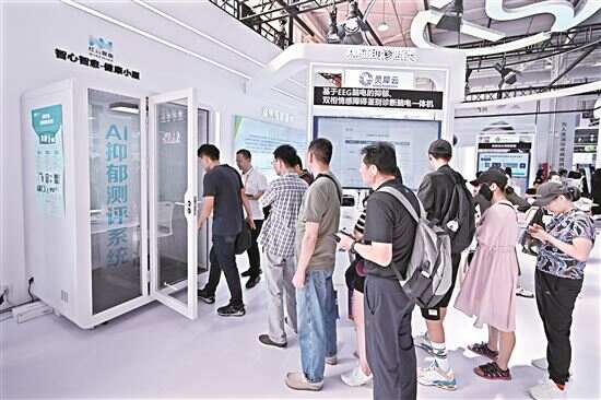 ■9月3日,参观者在首钢园北京安定医院展台内排队体验AI抑郁测评系统。
