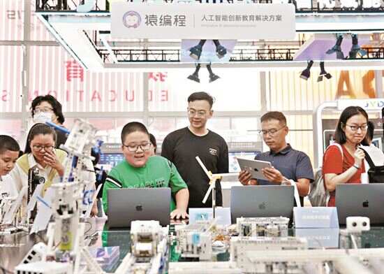■在首钢园的服贸会教育服务专题展区,小朋友在体验智能硬件编程作品。