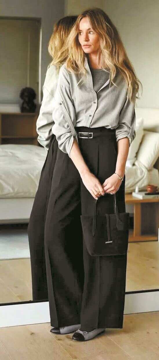 黑色腰带勾勒出腰线,增加造型层次感,并给上下身做出很好的比例区分。